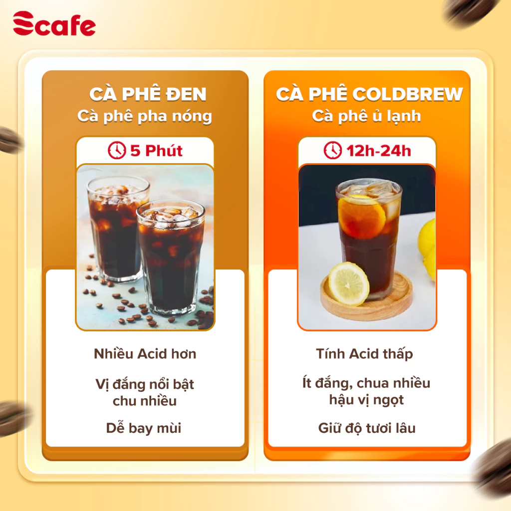 Thưởng thức hương vị cà phê độc đáo với sản phẩm cà phê cold brew của chúng tôi! Được chiết xuất từ những hạt cà phê nguyên chất, qua quá trình ngâm lạnh kéo dài, cà phê cold brew mang đến trải nghiệm uống cà phê tươi mát, không gắt, phù hợp cho mọi thời tiết.