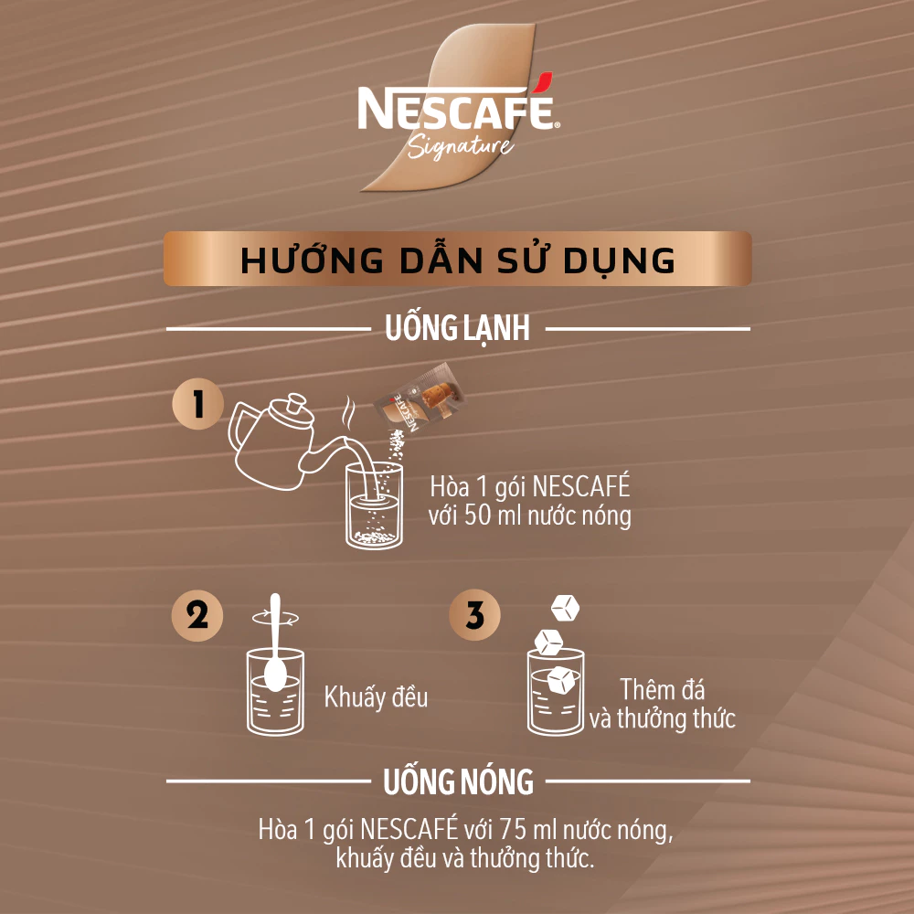 Hòa 1 gói NESCAFÉ với 75 ml nước nóng, khuấy đều và thưởng thức.